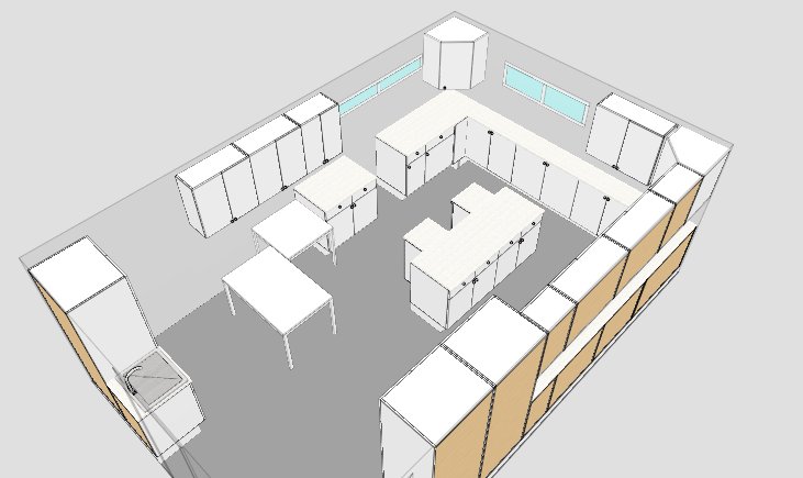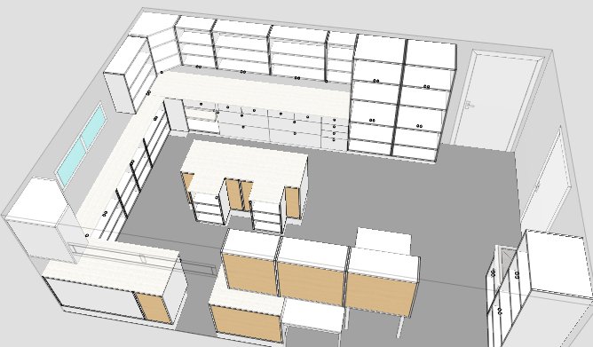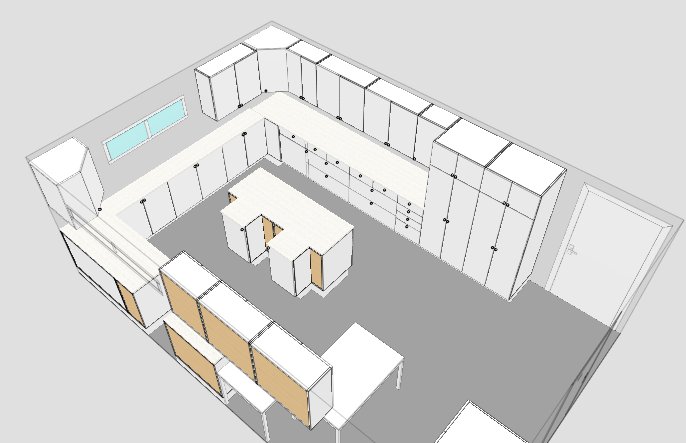 the whole thing... the space in between 1 and 4 is to place one trash can and a place to store my stool the top is obviously the cutting table and will have a surface of 40" x 72".. in parts 2 and 3 there are 4 drawer to put tools in... and the cupboards underneath are 36" x 24" deep so I should be able to store my QuiltCut 2 in one of those without every worrying about it. At one end of the cutting table I will have rails to hang my rules and templates... the cutters and scissors will be in the drawers away from innocent little fingers. Number 16+17 are two use cupboards... 30" x 24 " (WxD) by 80 inches high... those 2 should normally be devoted to the stash I am devoting a lot of effort in creating... LOL Nubmer 13+14+15 are all drawers entirely and normally should used to store my threads... the 13+14 are 36" X 24" deep and 15 is 18" X 24 " deep.. Number 19 is a corner unit and is huge... and normally is for your pots and pans but since it's a sewing room... I will not buy the metallic shelving that normally goes with it but will use it to store huge bolts or plastic bins... on top of 19 + 13 + 14 there is ample space to have 3 embroidery machines running at once... (DH is at this time designing the wiring so that I require only one PC for all machines cause there will be 3 more hopefully on the opposite wall and the proper lighting cause I would like to have neon.. real bright but also natural light lighting)... Number 9-10-11-12 (12 being under 28)... those are 30" x 12 1/4" deep units... I am not getting the doors for those units only the cupboard itself and I will use those for my books + magazines + instructions manual... they are actually cheaper then buying a book unit... LOL but of good solid material still. and on the wall above those but still under the window that is there... I will have railings going from one end to the other with little wire basket that are normally used to fit kitchen paper towel rolls but I will put my stabilizer rolls on there Example of the railing: http://tinyurl.com/axnpd Number 8+7 again the corner is a corner unit for big items and bins... on top I can fit 2 machines the little grey space between 7 and 18 will have a counter that will go over all units 7+8+18 ... and that will be my computer space... underneath the counter... a rolling stool will fit and against the wall a small printer and PC tower will be there... and another embroidery machine will be on top of the 18 Now granted at this time I don't have 6 embroidery machines, but one is allowed to dream and if one wants the dreams to come true... one has to be prepared... HA HA!! Now those two white spots at the left of number 18 are where an L shape counter will be for my 2 regular sewing and my serger to be with the chairs and all. Number 5+6... 5 is a sink unit where I will be able to wash out my stabilizer and glue and tools and whatever needs to be washed... with the proper products stocked underneath... Number 6 is another big cupboard of 30" x 80" high and 24 deep... this one is to store all those vases, flowers and other decorative items I use for my displays and such. All the above wall unit like number 20+21+22+29+28+23+24+25+26+27 will be to store everything that wasn't mentionned so far... quilt supplyes, smocking supplyes, knitting, crocheting, beads supplyes, blanks and such.. If I am lucky... I will be able to put one rail all around the walls on the back of the embroidery machines and have all the hoops for each one hanging on the wall on the back of each machines... and I will have something and I say something cause I don't know what it will be yet cause DH is thinking on it... but something of a thread stand that wouldn't take up too much space but that I also wouldn't have to move from one machine to the next hopefully Oh well ... I somehow feel shy having shared all of this... LOL Those 3 pictures below are to show you the view in 3 D... the total size of the room is something like 290 square feet DH said... apparently I am starting to compete with HIS garage and we just don't know how we feel about that... him annoyed or not or me jubilant or not... LOL ![]() Don't mind the two little cupboards for the cutting table.. the software won't let me put them right at the corners. ![]()